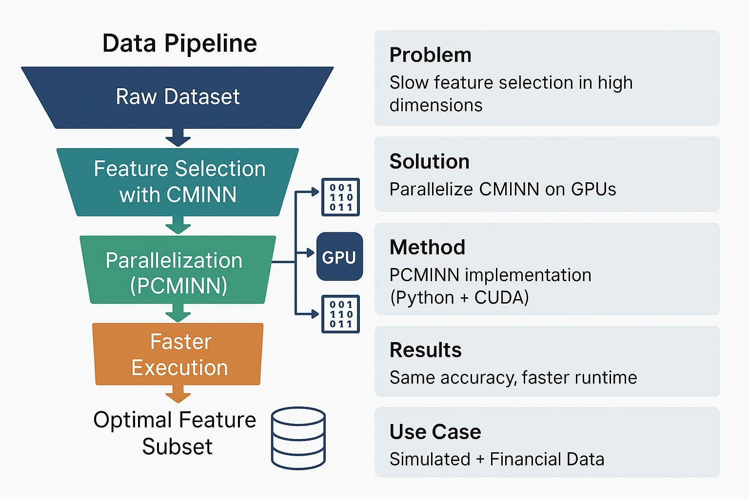 This study introduced PCMINN, a GPU-accelerated variant of the CMINN algorithm, aiming to overcome the computational bottlenecks of high-dimensional feature selection using conditional mutual information. The results from the simulation study across three datasets (A, B and C) affirm that PCMINN preserves the selection accuracy of the original CMINN method while drastically improving runtime efficiency.
