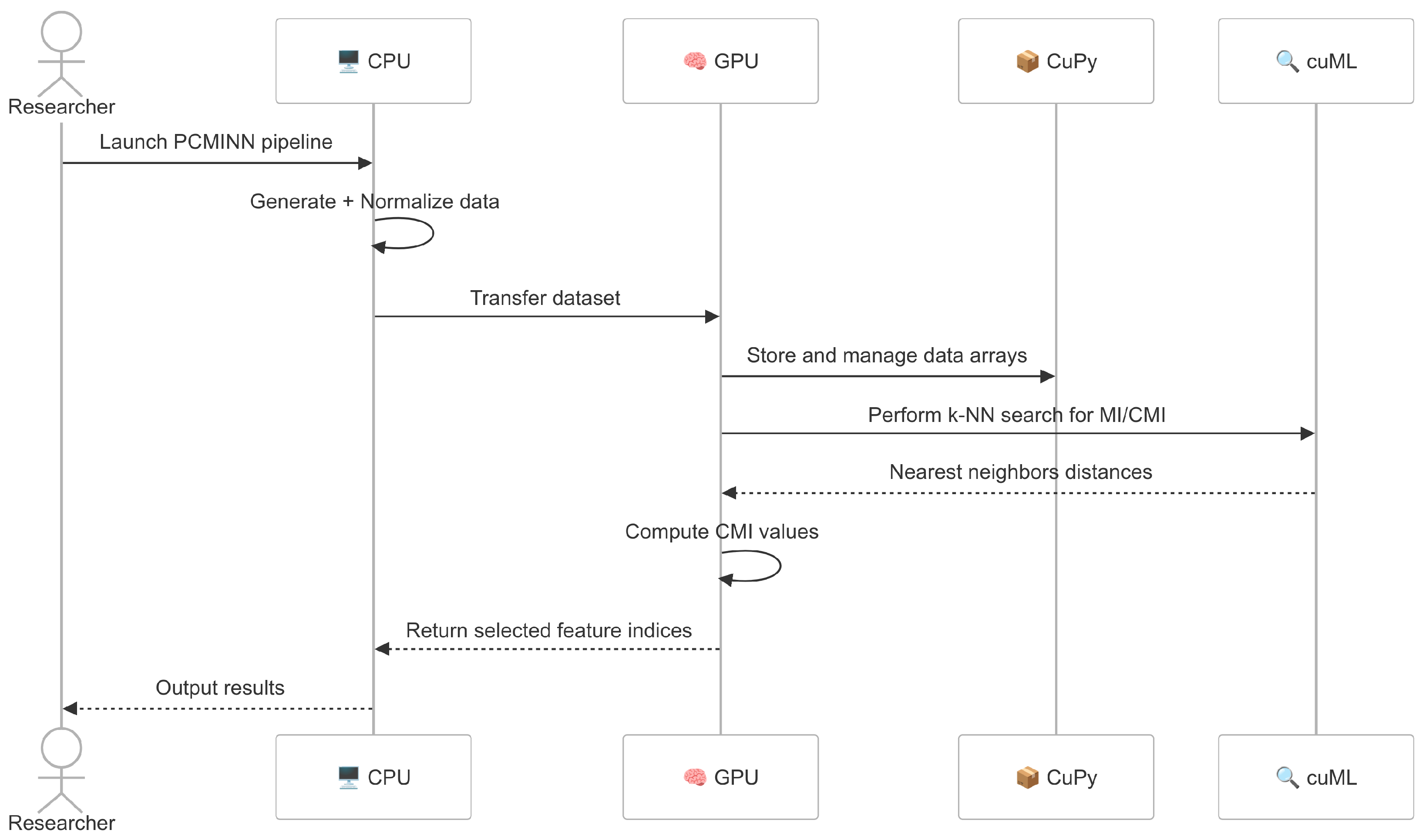 Interaction diagram of PCMINN pipeline across CPU, GPU, CuPy and cuML components. The CPU handles preprocessing and coordination, while the GPU executes the core computations.