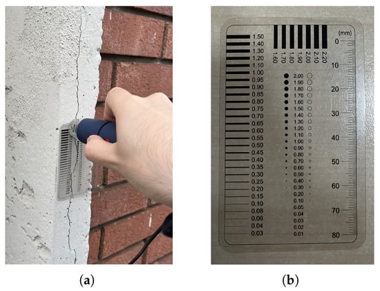 To validate the results of the automated crack detection system, manual measurements were conducted on site using a microscope camera and a crack gauge. The microscope camera allowed for a detailed examination of cracks, capturing high-resolution images that revealed intricate details often missed by conventional methods. A crack gauge, as seen in Figure 2b, was positioned within the field of view to provide a known reference distance for measurement calibration. The combination of these tools can be seen in Figure 2a.