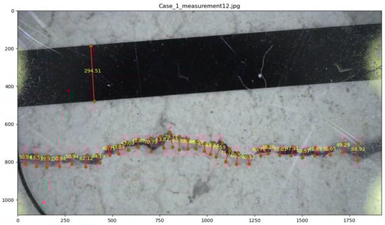 A custom measurement tool was developed to load these images and enable the manual definition of crack widths in pixel units. The user interface of this tool can be seen in Figure 3. The tool compared the pixel dimensions of the cracks to the known distance on the crack gauge, ensuring accurate measurements. Multiple measurements were taken at different locations along each crack to obtain the distribution of crack widths, and statistical methods were applied to these results to facilitate a comparison with the automated measurements from the proposed method. These statistical methods are explained in detail in Section 4.
