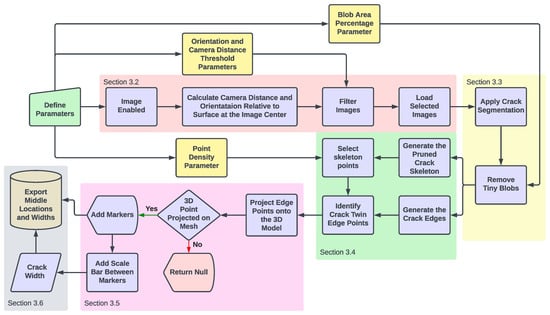 The developed Python (Version 3.9.13, suitable version with used Agisoft Metashape API) script introduces a systematic and automated approach for crack detection, segmentation, and measurement within the Metashape environment. Leveraging user-defined parameters, advanced image processing techniques, and 3D point projection, the algorithm streamlines the analysis of cracks in structural surfaces. It provides a robust framework for identifying crack features, measuring their dimensions, and exporting data for further evaluation. This automated solution enhances efficiency and accuracy in structural-health monitoring, offering a reliable tool for crack analysis. An overall flowchart of the system can be seen in Figure 5.