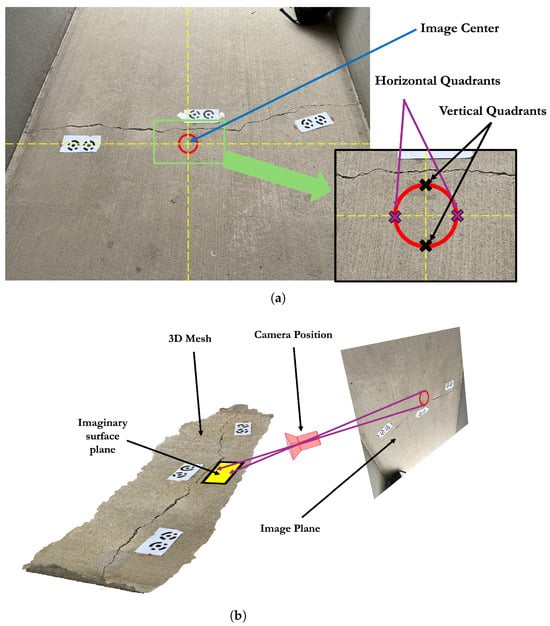 (a) Surface definition point selection of quadrants on image. (b) Projection of selected points on mesh for vertical case on surface using pinhole camera model.