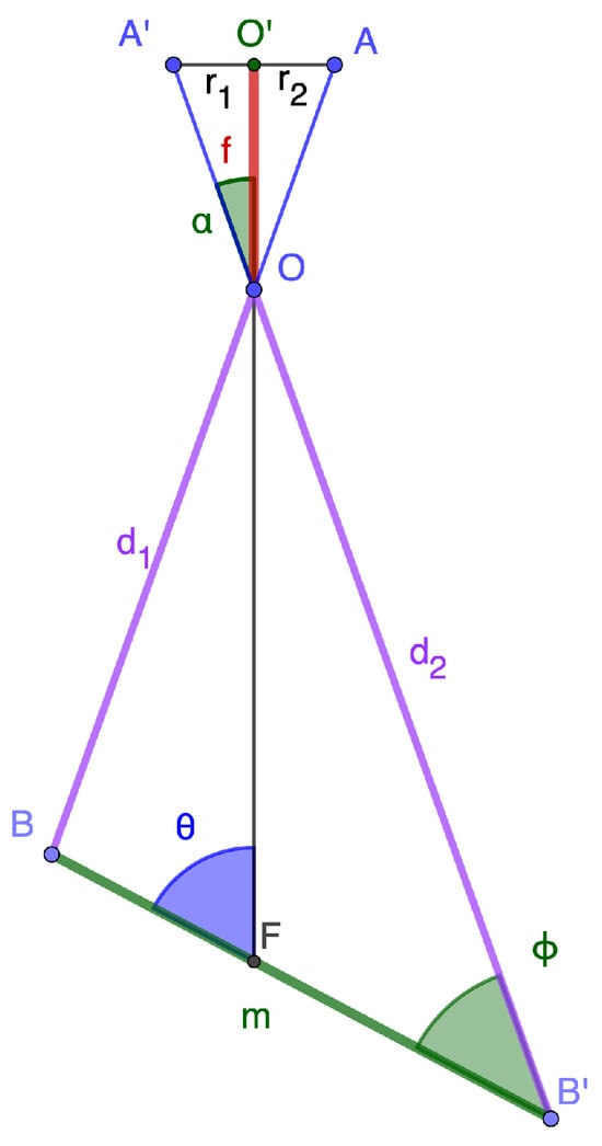 For orientation estimation, a local surface plane is defined using an imaginary small circle with radius r centered on the image. Four quadrant points on this circle are projected onto the 3D surface using the pinhole camera model, with two points aligned vertically and two horizontally. The distances between the camera center and these projected points are calculated, yielding four distance values per image. Using these distances ( and ) and the camera’s focal length f, two similar triangles are constructed to determine the angle between the camera plane and the surface for each axis, as seen in Figure 7. The orientation angle is derived using geometric relationships and trigonometric functions, as detailed in Figure 6.