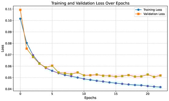 A modified version of a publicly available repository [22], supporting both VGG16 and ResNet101 CNN architectures, can be trained. For this work, ResNet101, with its 101 layers, was selected due to its superior performance on larger datasets [23]. Training was conducted using the publicly available crack datasets seen in Table 1, including pavement and concrete crack images, with the latter manually annotated to ensure relevance. Images were resized into 448 × 448 pixels to match the model’s input size. Training was performed on a MacBook Pro with an M1 Pro processor, using default hyperparameters and a batch size of 2 due to memory constraints. The model was trained until no further improvement in validation loss was observed, with the final model selected from epoch 24, as seen in Figure 8.