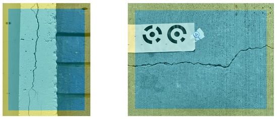 Two primary approaches were considered for model inference. The first involves down-sampling images to 448 × 448 pixels, applying the model, and subsequently up-sampling the results to the original dimensions, as seen in Figure 10. While computationally efficient, this method results in loss of detail, often leading to either overestimation or failure to detect cracks. The second approach retains the original image resolution and applies a 448 × 448-pixel sliding window to detect cracks, combining the results into the original image. The window can be overlapped to mitigate detection loss at patch boundaries. In cases of large datasets, non-overlapping processing can be employed for efficiency. Empirical observations indicate that non-overlapping processing also produces satisfactory results, as demonstrated in Figure 11. However, to prevent the fragmentation of cracks at window edges, an overlap of 50% in both the vertical and horizontal directions was selected.