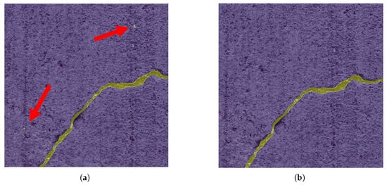 The cleaningprocess with blob removal on an example. (a) The initial result of the model; (b) the cleaned result. Yellow regions mean that pixels indicate a crack. Red arrow indicates the removed blobs.