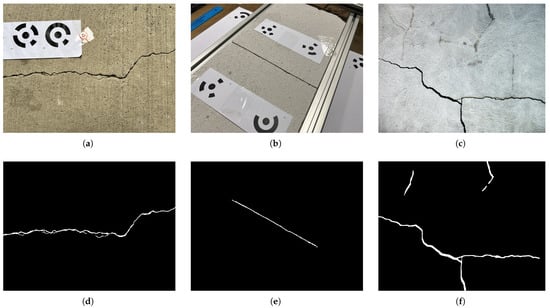 (a–c) Examples of crack images. (d–f) Corresponding crack segmentation respectively.