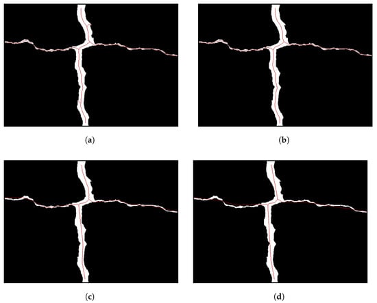 Different simplification levels with Discrete Curve Evaluation: (a) original skeleton with burrs, (b) DCE simplification level 5, (c) DCE simplification level 10, and (d) DCE simplification level 15. Red line denotes estimated crack skeleton.