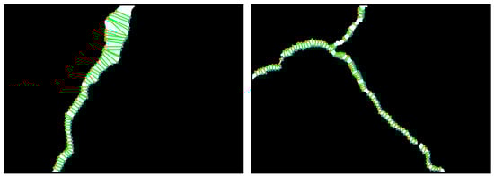 Crack edges were detected using the Canny edge detection algorithm [33]. With both the skeleton and edges identified, twin points representing the crack width were determined using a hybrid approach adapted from [34], which combines two established techniques: the shortest method and the orthogonal method. The shortest method selects edge points closest to the skeleton, while the orthogonal method uses an adaptive window around the skeleton point to identify edges in a direction orthogonal to the skeleton’s propagation.
