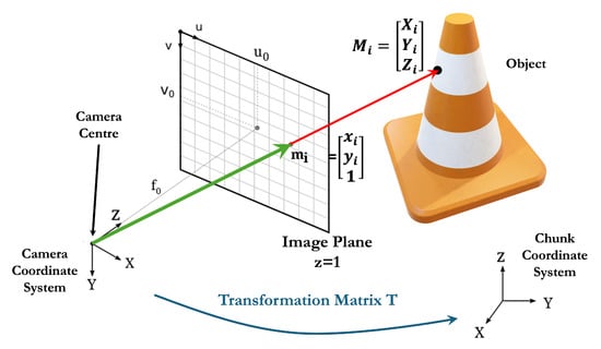The projection process begins by identifying the pixel coordinates (u, v) of the crack edge relative to the image’s top-left corner. These coordinates are undistorted using camera parameters and converted into a 3D point (x, y, z) in the camera coordinate system, with z set to 1. The 3D point is then expressed in homogeneous coordinates to facilitate transformations, including translation and rotation. Metashape internally computes the required transformation matrix, which converts the 3D point from the camera coordinate system to the chunk (world) coordinate system. This conversion can be presented mathematically as