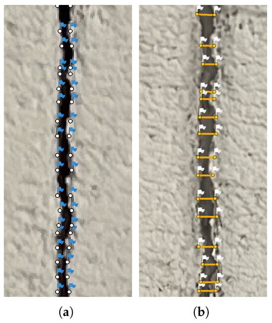 Estimated crack edges and widths in Metashape UI (user interface). (a) Selected crack twin edges on image. (b) Projected crack twin edges on mesh. Points with blue or white flags represent crack edge, while yellow lines between flags denote crack width.