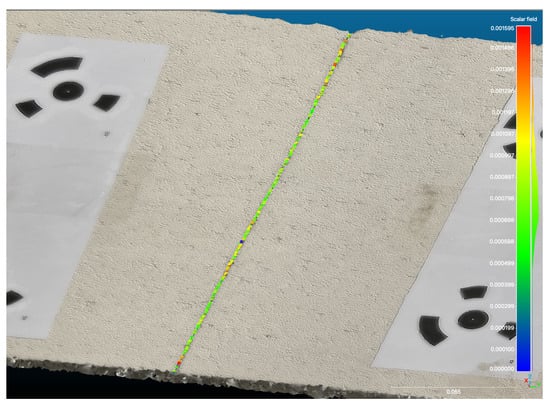 While Metashape excels at photogrammetric processing, its interface lacks optimized tools for crack visualization. The textured mesh (exported as an .obj file with local coordinates) and the Python-generated .txt file of crack midpoints and widths, which are based on same coordinate system, were combined in CloudCompare, enabling the enhanced 3D visualization and analysis of cracks. The example results can be seen in Figure 19.