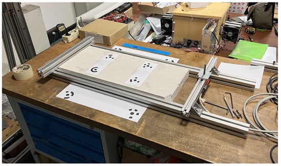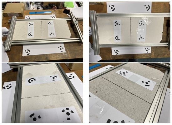 To evaluate the crack detection system, lab tests used an Autoclaved Aerated Concrete (AAC) block split centrally to simulate a straight crack. To model varying crack widths, an enclaving skeleton was assembled from aluminum profiles. This skeleton fixed one part of the AAC block while allowing the other part to move with a single degree of translational freedom, as illustrated in Figure 20. This setup enabled the adjustment of the crack width by moving one of the blocks. For this experiment, three different crack widths (w and for average crack width) were considered, as seen in Figure 21. Additionally, a laser distance sensor was attached to measure the displacement of the moving block between tests, providing validation for the manual measurements.
