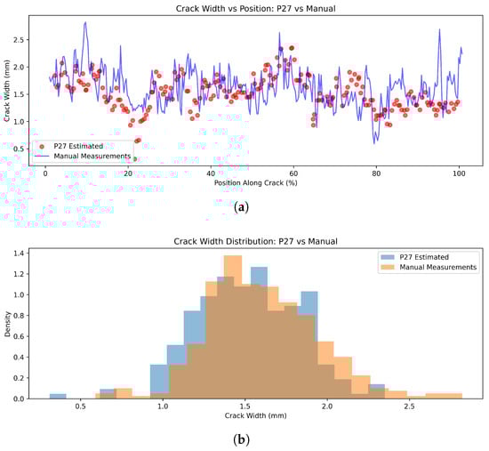 Example of good fit between manual measurements and estimated measurements: (a) comparison between positions along crack; (b) comparison of histograms.