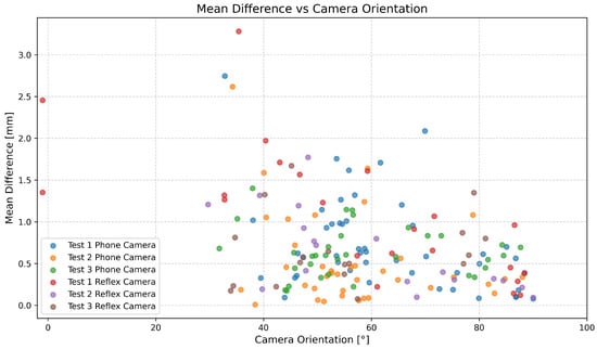 Scatter plot of mean difference vs. camera orientation for all tests.