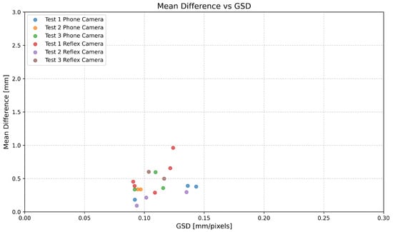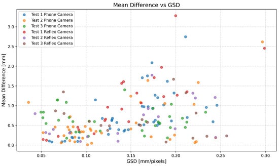 The results obtained after applying the thresholds are illustrated in Figure 26, where the maximum mean difference error drops less than 1 mm, while average mean difference error is less than 0.5 mm. A comparison between Figure 25 and Figure 26 demonstrates that by implementing the orientation and GSD thresholds, it is possible to pre-select images with the potential to yield more accurate results before executing the proposed system. This pre-selection process enhances efficiency and ensures higher-quality outcomes by filtering out images that are unlikely to meet the desired accuracy criteria.