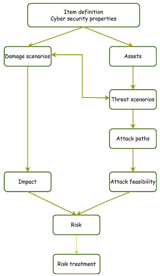 - Asset identification: Assets are valuable components within a vehicle system that require protection from cybersecurity threats. Each asset has associated cybersecurity properties and potential damage scenarios. As shown in Figure 1, this phase corresponds to the “item definition and cybersecurity properties” box, which produces the assets and damage scenarios as outputs. The cybersecurity properties that must be protected according to ISO/SAE 21434 are as follows: