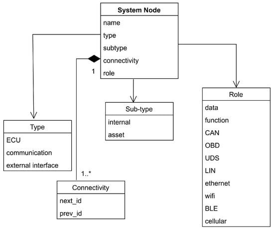 Figure 3. UML class diagram of the asset model in GAPP. - Attack path analysis: Following impact rating, the TARA process requires an analysis of attack paths as specified in ISO/SAE 21434 Section 15.6 [5]. As shown in Figure 1, this step takes input from the previous steps and it analyzes how attackers can exploit vulnerabilities to realize the identified threat scenarios. According to the standard, an attack path is the combination of various attack actions that, when applied successively, lead to the threat scenario. The standard acknowledges that in early development stages, attack paths may be incomplete or imprecise as specific implementation details may not yet be available. Much of the difficulty of the TARA process lies in the identification of the most relevant attack paths. Traditional manual approaches often struggle with the combinatorial complexity of potential attack sequences. Our GAPP methodology directly addresses this challenge by employing a graph-based approach to systematically identify and analyze attack paths. The formal model described in Section 4.4 provides the mathematical foundation for this analysis, while the implementation detailed in Section 5.2 leverages graph database technology to execute these algorithms.
