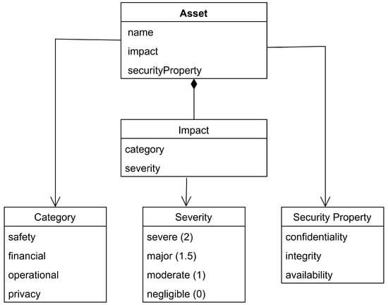 In our methodology, we formalize these impact ratings in the asset model shown in Figure 3, where the impact attribute is represented as a composite structure containing both category and rating. We map these qualitative ratings to numerical values (severe: 2; major: 1.5; moderate: 1; negligible: 0) to facilitate quantitative risk assessment calculations later in the process.