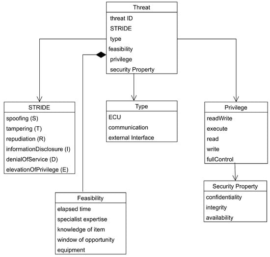 Figure 2. UML class diagram of the system model in GAPP. - Threat scenario identification: Following the asset identification, the TARA process requires identification of the threat scenarios that could compromise the security properties of identified assets as specified in the ISO/SAE 21434 Section 15.4 [5]. As illustrated in Figure 1, this step builds directly upon the defined assets and their cybersecurity properties. The standard notes that additional information may be included, such as damage scenarios, technical interdependencies between assets, and attack surfaces. It also recognizes that a single damage scenario may correspond to multiple threat scenarios, and conversely, a threat scenario may lead to multiple damage scenarios.In our methodology, we formalize these threats using the threat model defined in in Section 4.3. The UML class diagram represents threats aligning with the ISO requirements: the targeted asset (via the type attribute), the compromised security property (SP), and the cause of the compromise (represented by the STRIDE category and the threat identifier).