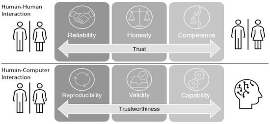 Dimensions of trust and trustworthiness in the interaction between individuals as well as between individuals and systems, displaying the three basic concepts of trust in AI [].