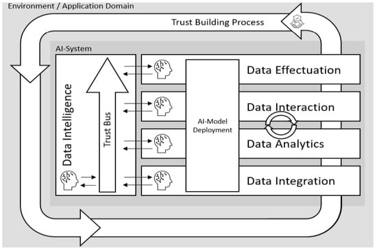 Trust is based on the output of an individual or system []. Each layer of the conceptual TAI-BDM reference model (c.f. right side of Figure 2) produces its own output. Hence, each layer with AI support needs an individual trust component based on its output within the data intelligence layer. This part of the system represents the ability of the organization to acquire knowledge and skills in the context of big data management [].
