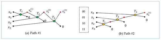 Here, the angle is defined by the inputs as , and if . The path of the transformation, which is shown in Figure 1a, is the traditional path, and this transformation is called the DsiHT with the weak carriage-wheel (see [24] for more detail). Two rotations are on the adjacent BPs, that is, 0 and 1, and 0 and 2. The last rotation operates on BPs 0 and 3, which are not adjacent. The transform of the generator is equal to