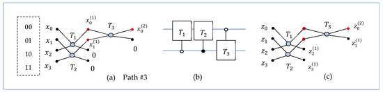 Figure 2a shows path #3 for the four-point DsiHT. All three rotations in this transform operate on the adjacent BPs. These BPs are 0 and 2, 1 and 3, and then 0 and 1. This path is considered good for building the circuit of the corresponding 2-qubit QsiHT. The quantum circuit of the transformation is shown in Figure 2b. Here, three controlled-rotation gates are used (see for detail [36]). The transform of an input signal, z, is calculated by the same diagram, as shown in Figure 2c.