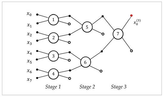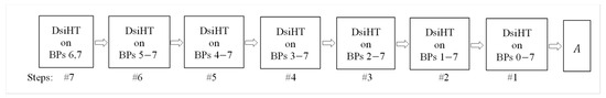 The block diagram of the decomposition of the matrix, , is shown in Figure 5. According to the described QR decomposition, or the operation triangularization (factorization), it is fulfilled by seven DsiHTs,
