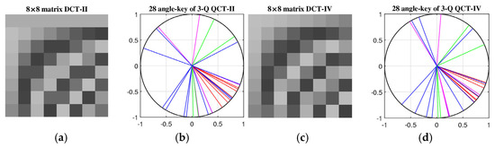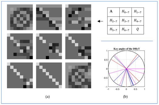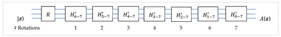 Now, we consider a square unitary matrix, of size , with determinant . For this matrix, seven DsiHTs with different paths are used. In the first step, the eight-point DsiHT is generated by the first column of . We change the notation of matrix of this transform by . The subscript indicates the bit planes on which the transform operates. In the second step of the calculations, the seven-point DsiHT is generated by the vector that is equal not to the full second column of the new matrix, , but to the reading from the second row. The first row and column of the matrix will remain unchanged in subsequent calculations. Thus, the seven-point DsiHT operates on the bit planes 1–7, not 0–6. We denote the matrix of this transformation as . In the next step of the decomposition, the six-point DsiHT is generated by the columns number, three, of the new matrix , but to the reading from the third row. This six-point DsiHT with matrix operates on the bit planes 2–7, and so on. The last DsiHT operates on the bit planes 6 and 7, and its matrix is denoted as . In quantum computing, it is important to remember the location of these generators for the next rotations.