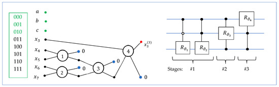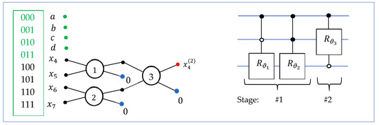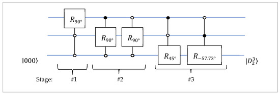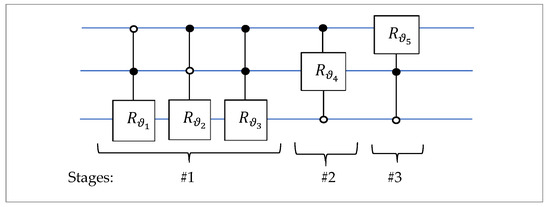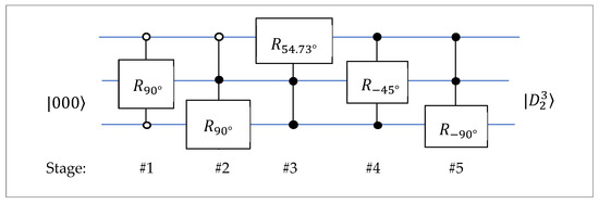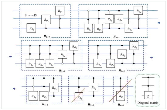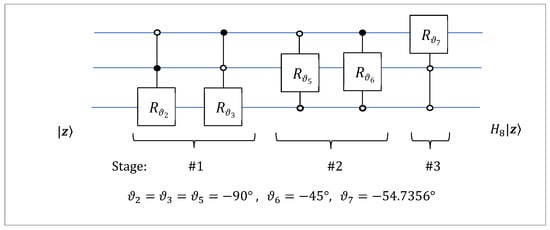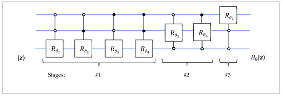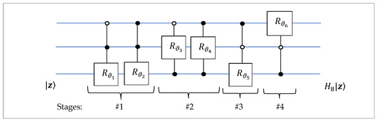 The corresponding circuit for the 3-qubit QsiHT with seven controlled gates of rotations is given in Figure 8. The matrices of rotations are defined by
