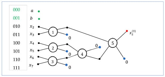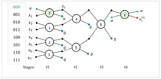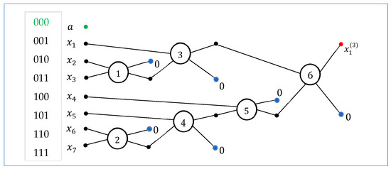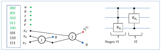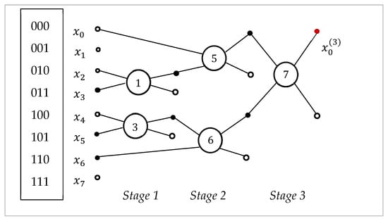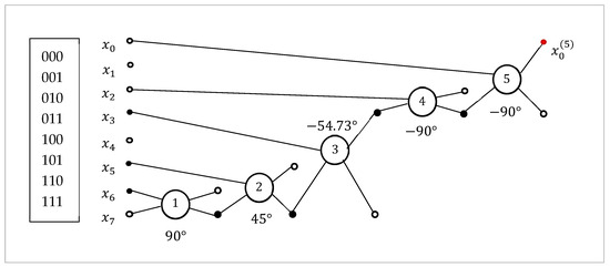 C. The case (transform ): The input is the 3-qubit superposition in the form of , and the transform keeps the first two amplitudes, and , unchanged. The block diagram of this eight-point DsiHT is shown in Figure 13. After the fourth rotation, the next rotation operates on bit planes 2 (010) and 6 (110).