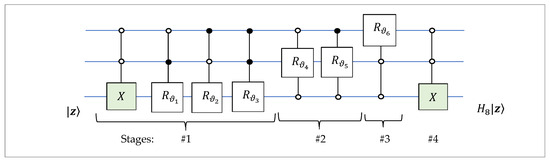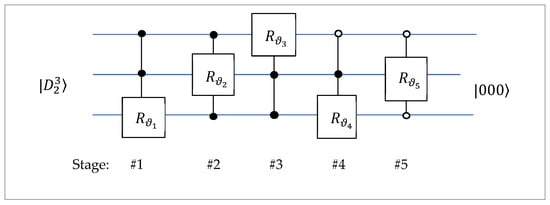The quantum circuit for the 3-qubit QsiHT with this new path is given in Figure 12. This circuit does not use the gate.