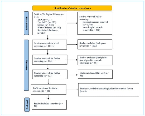 The initial search across designated databases yielded 3441 records (Figure 1). A two-stage screening methodology, employing Rayyan software version 1.5.0 for deduplication [15], and ASReview version 2.0 (open-source machine learning-assisted tools) for screening, was used to manage this volume [16].