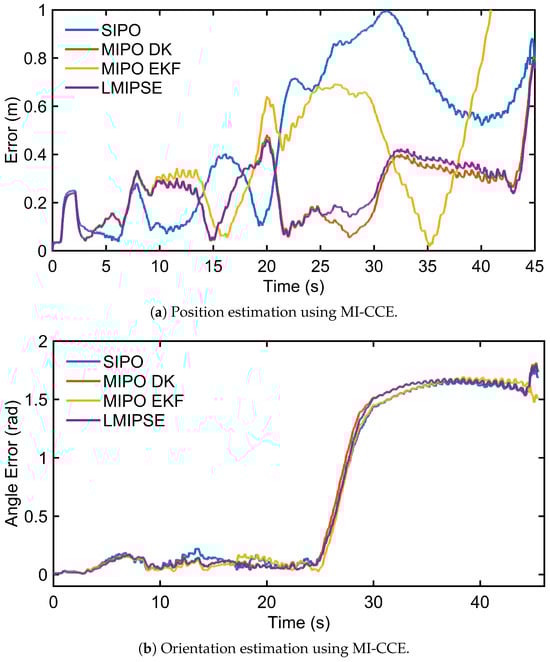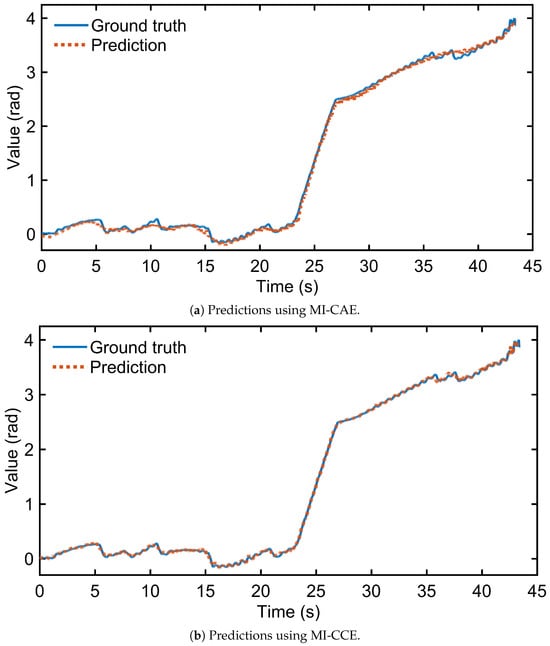 Table 2 summarizes the testing accuracy of the two CNN-based models using different training set sizes. After experimenting with various sizes, we chose to use 3000 random data points to balance performance and generalization. Furthermore, Figure 2 compares the yaw prediction results of MI-CAE and MI-CCE, demonstrating that MI-CCE achieved smaller prediction errors. Since the yaw predictions are used for EKF, we further tested the performance of the two models for state estimation.