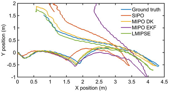 Table 4 summarizes the results of various state estimation methods under high IMU noise. Our LMIPSE using CCE achieved the best results regarding all three performance measurements. Furthermore, LMIPSE is more robust to increased noise levels than MIPO with DK, since the median drift was increased only by 0.03% for LMIPSE compared to 0.25% for MIPO with DK. Furthermore, Figure 3 compares the trajectory estimation, and Figure 4 compares the state estimation results of LMIPSE and other methods. The MIPO EKF estimator, without motion capture assistance, begins to diverge significantly due to yaw estimation error. Our proposed LMIPSE method continues to accurately track the ground-truth trajectory, in contrast to the divergence observed in other methods. These experimental results show that learning-assisted correction is more resilient to drift over time, demonstrating the robustness of our proposed LMIPSE method. The runtime of our LMIPSE is approximately 3 ms (including 0.5 ms ResNet1D model inference time on an NVIDIA Jetson Orin (sourced from NVIDIA, Santa Clara, CA 95051, USA) platform and 2.5 ms MIPSE runtime on an Arduino Teensy board), which is within budget (5 ms) and satisfies the real-time requirements of many robotic platforms.
