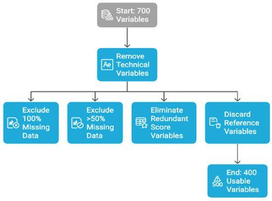 The data-cleaning process began with an initial pool of 700 variables extracted from the TIMSS 2019 database. Figure 2 outlines the key stages of this process. Several steps were taken to refine the dataset and ensure its reliability. First, 41 technical variables, including identifiers, weights, metadata, and duplicates, were removed, as they held no analytical value. Then, 61 variables with 100% missing values were excluded; these included items that were not administered in the Moroccan version of the survey, such as country-specific curriculum questions. An additional 74 variables with more than 50% missing data were also removed, as they related to rarely implemented school policies. To eliminate redundancy, 29 variables representing numerical scores already captured in alternative formats were discarded. Finally, 95 reference variables, particularly the plausible values (PVs), were excluded to avoid introducing bias into the predictive models. After this careful and systematic cleaning process, 400 variables remained, forming a robust and well-structured dataset suitable for the exploratory analysis and machine learning applications.