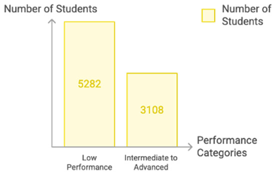 As a result, the final classification retained only two categories, as illustrated in Figure 3, the first representing students with low performance and the second grouping those with performance ranging from intermediate to advanced. This binary distinction facilitated the application of classification algorithms, while also enhancing the stability and interpretability of the predictive models.
