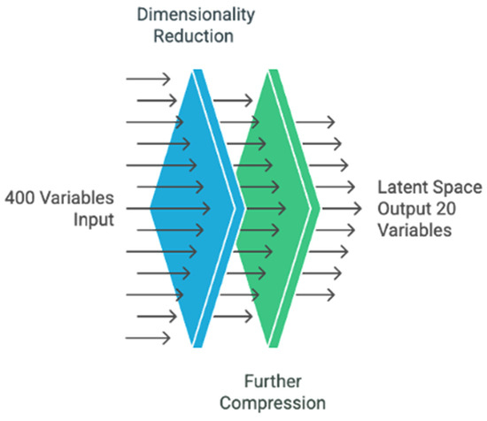 In this study, an autoencoder was employed to reduce the dimensionality of the dataset [24]. The objective was to transform this high-dimensional input into a more compact latent representation, Figure 4, while preserving the essential information required for accurate predictions. The encoder architecture consists of two successive dense layers: the first maps the 400 input variables to a hidden layer of 100 neurons, and the second compresses this representation into a 20-dimensional latent space, denoted as Z. The choice of compressing the input space into 20 latent dimensions was based on empirical validation. Several configurations (10, 15, 20, 25, and 30 latent units) were tested during model tuning. The 20-dimensional representation consistently produced the best balance between classification accuracy and latent space interpretability. Smaller encodings led to a loss of predictive power, while higher-dimensional encodings resulted in marginal performance gains but increased complexity. Thus, 20 latent variables were retained as the optimal dimensionality for our analysis.