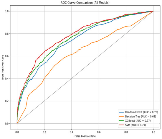To complement the evaluation based on the accuracy and F1-score, we also assessed each model’s discriminative ability using the Receiver Operating Characteristic (ROC) curve and its corresponding Area Under the Curve (AUC). The ROC curve provides a detailed picture of each classifier’s ability to distinguish between high- and low-performing students across the full range of classification thresholds. While the SVM model achieved an AUC of 0.79, which is considered moderate in absolute terms, it reflects a reasonably strong performance in the context of high-dimensional, imbalanced, and noisy educational data. The accompanying F1-score of 0.73 reinforces the model’s ability to maintain a balance between precision and recall, making it a useful tool for identifying at-risk students with acceptable reliability.