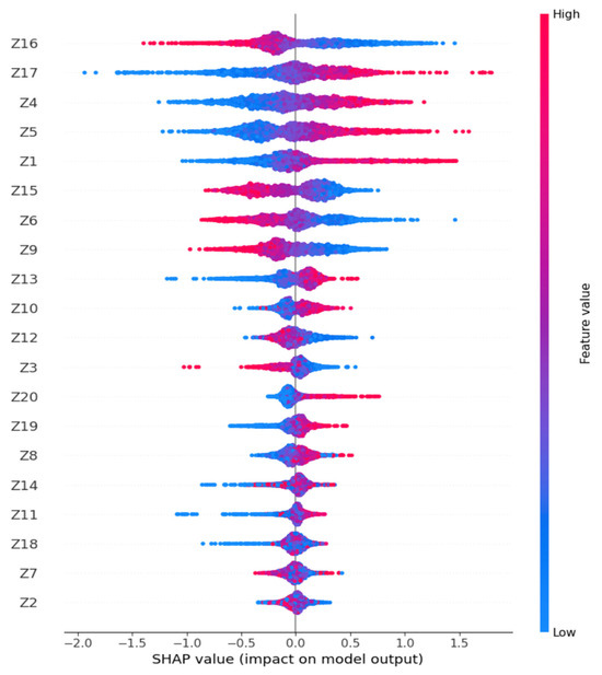 The results reveal that certain latent dimensions play a decisive role in the classification process. Notably, variables Z16, Z17, Z4, Z5, and Z1 emerge as the most influential, as evidenced by their wider SHAP value distributions and greater distance from zero. For example, high values of Z16 (shown in red) are predominantly located on the right side of the graph, suggesting a strong positive impact on the prediction of high academic performance. In contrast, other variables, such as Z15 or Z6, exhibit more ambiguous behavior, where the effect depends on the specific value taken by the latent feature itself.