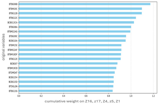 By summing the absolute weights associated with these five latent dimensions, we were able to extract the top 20 original input variables that exerted the strongest influence on the construction of the latent space. In other words, these variables played a critical role in shaping the internal representations learned by the autoencoder.