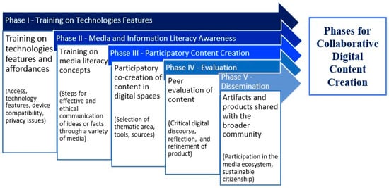 The study design involved five stages, responding to the European Commission’s DigComp 2.2 [35] framework and, additionally, synthesizing Reynolds’ [75] concept of social constructivist task-driven practices for digital literacy. More specifically, the phases of the study design and implementation process involved the following: