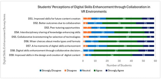 Principal Component Analysis (PCA) was conducted to check the nine items assessing digital skills enhancement through collaboration in a VR learning context. The Kaiser–Meyer–Olkin (KMO) measure confirmed sampling adequacy (KMO = 0.925) and Barlett’s test of sphericity, which was significant (χ2 656.14, p < 0.001). One component was extracted with an eigenvalue > 1, which explains 79.0% of the total variance. All item loadings exceeded the commonly accepted threshold of 0.70. The scale demonstrated excellent internal consistency (Cronbach’s α = 97), indicating that all items measure a single underlying construct. Responses were collected on a five-point Likert scale (1 = Strongly Disagree—5 = Strongly Agree). Table 2 displays the item codes and survey items and their corresponding component loadings.