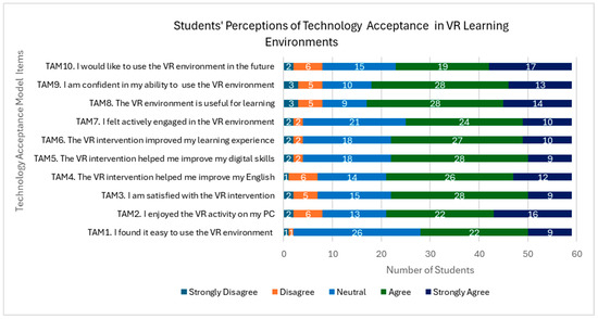 - Ten items assessing the student’s perceptions of usefulness and ease of use of the VR technology based on the Technology Acceptance Model [83];