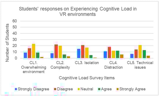 Principal Component Analysis (PCA) was conducted on five items assessing cognitive load in the VR learning environment. The KMO measure was 0.750, and Barlett’s test of sphericity was significant (χ2 (10) = 72.12, p < 0.001), confirming sampling adequacy. One component was extracted, accounting for 52.80% of the total variance. All items loaded strongly on this single factor, with loadings ranging from 0.700 to 0.762, indicating a coherent unidimensional construct. To assess internal consistency, a reliability analysis was conducted using Cronbach’s alpha. The scale consisted of five items, measuring students’ perceived cognitive load while interacting within the VR space. The analysis yielded a Cronbach’s α = 0.77, indicating acceptable internal consistency for the scale. This suggests that the items reliably measure a single latent construct. Table 4 displays the item codes and survey items and their corresponding loadings.