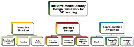 Oje et al. [45] posit that VR fosters schema formation through embodied interactions, real-time feedback, and contextualized learning. Sweller [46] underscores the importance of educational technology and instructional design to limit cognitive load, while [47] investigate the redundancy effects for contextual understanding in VR environments. E-Inclusion [48] does not only focus on learners with disabilities in its narrow interpretation, but also diverse forms of heterogeneity [49], needs and preferences, prior knowledge and starting point, sociolinguistic barriers due to population mobility [18], the right to equitable education, social justice, active participation [50], and interactions with all aspects of education [51], unlocking opportunities for education for all. Technology and connectivity play a vital role in fostering inclusive digital learning to promote accessibility by tailoring the experience to individual needs. The literature suggests that emerging technologies such as virtual and augmented reality can address today’s educational landscape gaps for fairness and equal access to bridge the digital and cognitive divide, utilizing a rich toolkit of media [52,53], while highlighting the effectiveness of generative strategies in VR environments that deepen understanding and enhance retention. These strategies include self-explanation, summarization, critical thinking, and comprehension by active processing of information [47,54]. Nevertheless, multimodal representations and inputs should align with learners’ cognitive processes [55], investigating how learners can process these inputs in sensory-rich VR learning settings [56]. Studies suggest that the strategic combination of multimodal signals that combine text, visual, and auditory cues can reduce distraction in VR environments, thus triggering learners’ attention to specific learning objects [57,58]. Wehrmann and Zender’s [59] review focuses on the relevance of UDL to designing inclusive VR learning environments. The researchers stress the limited insights from K-12 studies and identify the need for future research to investigate the impact of audio-visual and locomotion systems, participatory and user-generated content, scaffolding, and automated assessment on student attitudes and self-perception. The review additionally underscores the need for inclusive embodied learning, collaboration guidelines, metacognitive support elements, and learning transfer.