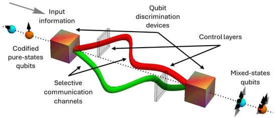 Figure 1 illustrates a complex scenario in which photons carrying quantum states cross an imperfect optical fiber bifurcated into two identical paths. The photons are directed along one path (green or red) according to a secondary quantum property (cubic devices) prepared in superposition. Local operations (thin layers) may also be complementarily applied to each path. Regardless of the specific configuration, channel noise produces mixed output states; however, such architectures have been shown to improve communication quality through interference effects [,].