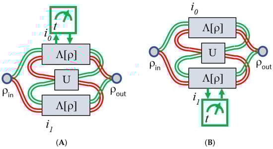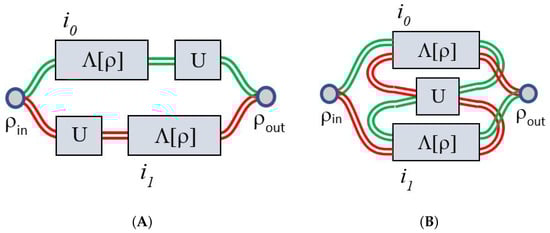 It is well established that imperfections in communication channels can be mitigated when such channels are embedded within transmission schemes capable of generating interference between alternative paths. In these configurations, undesirable effects arising from noise or imperfections can be suppressed through destructive interference, whereas successful transmission is enhanced via constructive interference. Schemes such as Path Superposition (PS) and Indefinite Causal Order (ICO) [,] have demonstrated such interference-based improvements. Furthermore, the inclusion of additional intermediate unitary operations enables the tuning or synchronization of desirable interference effects, making them applicable to a wider class of imperfect channels beyond those in which interference naturally arises. Both schemes are illustrated in Figure 3: (A) PS configuration and (B) ICO configuration. PS has long been implemented in photonics and quantum mechanics as a fundamental experimental element, most notably through the Mach–Zehnder interferometer, including extensions to matter systems []. In contrast, the ICO originated as a recent theoretical proposal [], but has already been validated through experimental implementations [].