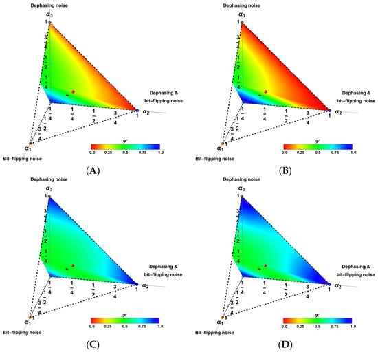 Figure 5 depicts the geometric averages (A) , (B) , (C) , and (D) in color, represented within the parametric space of the Pauli channels [,]. The points in the four corners correspond to (a) the transparent channel ( at the origin) and the primary pure syndromes, (b) the bit-flipping channel (), (c) the dephasing channel (), and (d) the bit-flipping combined with the dephasing channel (). Additionally, the black dot corresponds to the depolarizing channel (), while the red dot represents the ICO-channel () []. Only one-half of the complete plot is shown in each case due to the expected symmetry of the geometric averages ( exchanges with by switching and ). An increasing improvement in the geometric fidelity generated by the ICO scheme is observed. Table 2 reports the mean and the standard deviation for the geometric mean fidelity of these transmission schemes across the entire parametric space of the channels. However, the 3-QC scheme enhances the fidelity in the vicinity of the transparent channel and for many others deteriorates it. This effect varies with other schemes.